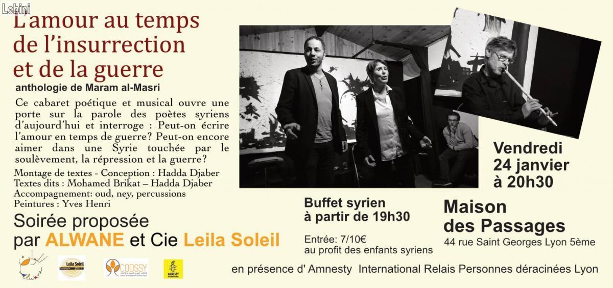Ce cabaret poétique et musical ouvre une porte sur la parole des poètes syriens d’aujourd’hui et interroge : Peut-on écrire l’amour en temps de guerre ? Peut-on encore aimer dans une Syrie touchée par le soulèvement, la répression et la guerre ?