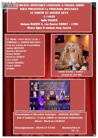 Aurely Prive notre invitée d'honneur pour notre spectacle de la Société Artistique Lyonnaise le samedi 27 janvier 2018 à 14h30 à la Maison RAVIER 5, rue Ravier 69007 - LYON. Les artistes de l'association rendront également en début de seconde partie juste avant notre invitée un hommage à notre Big Boss à toutes et à tous "Johnny Hallyday".